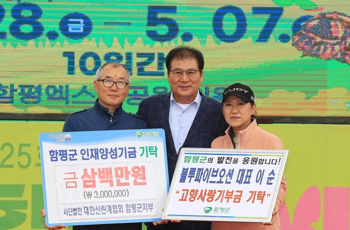 9일 군에 따르면 대한산란계협회 함평군지부에서 인재양성기금 300만원을, 블루파이브 오션 대표 이순 씨가 고향사랑기부금 100만원을 기탁했다.