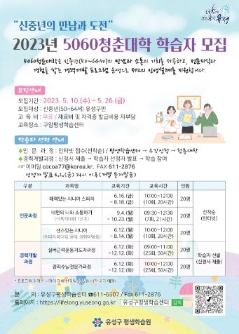[제주교통복지신문 김강석 기자] 대전 유성구는 오는 10일부터 2023년도 5060 청춘대학의 신규 학습자를 모집한다고 밝혔다.
