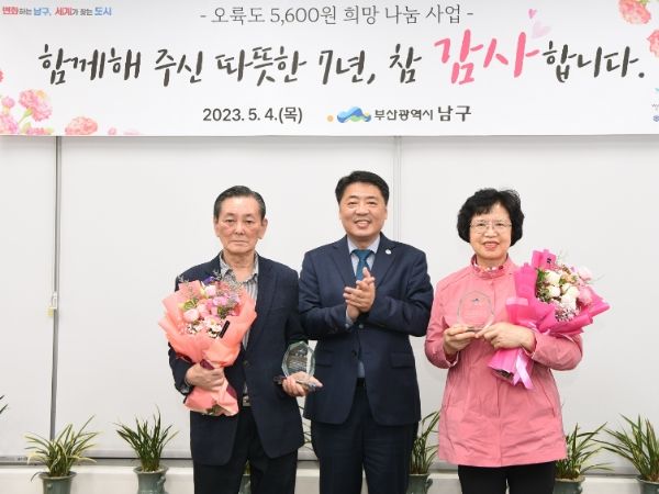 [제주교통복지신문 김강석 기자] 부산광역시 남구에서는 지난 4일‘오륙도 5,600원 희망나눔 사업’장기후원자 2명에게 감사패를 수여했다.