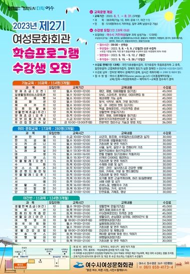 [제주교통복지신문 김강석 기자] 여수시 여성문화회관에서 6월부터 8월까지 진행하는 ‘제2기 여성문화회관 학습프로그램’ 수강생 518명을 모집한다.