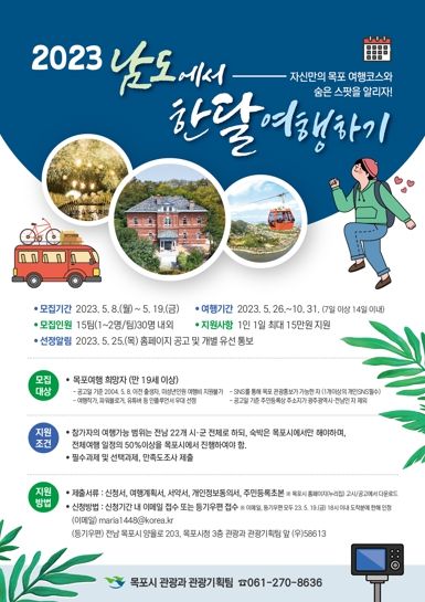 [제주교통복지신문 김강석 기자] 목포시가 장기여행하며 목포의 아름다움을 체험하고, 자신만의 여행코스와 숨은 관광자원을 홍보할 ‘한 달 여행하기’ 참가자를 오는 19일까지 모집한다.