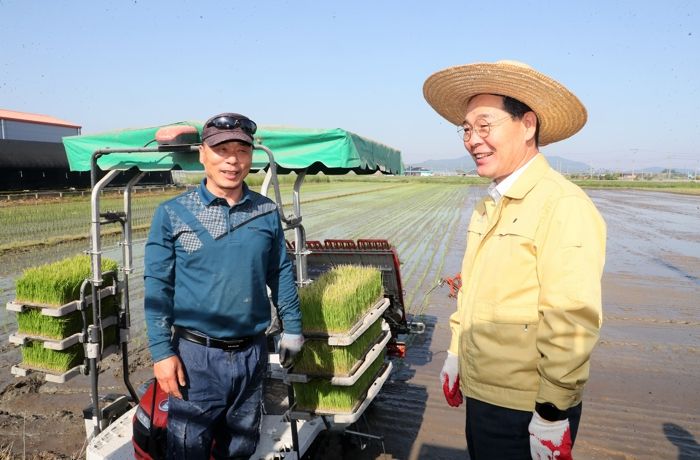 이날 모내기는 2023년 부안군 첫 모내기이며 조생종인 해담벼로 특별한 기상 이변이 없이 적기 영농이 추진된다면 추석 전인 오는 9월 상순에는 햅쌀을 맛볼 수 있을 것으로 보인다.