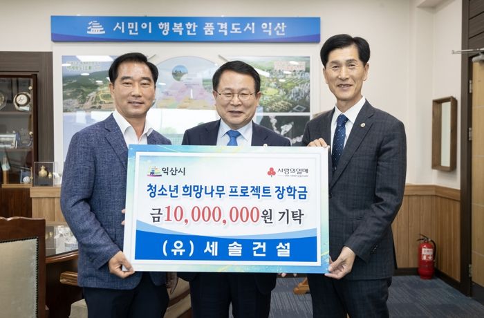 [제주교통복지신문 김강석 기자] (유)세솔건설은 지난 9일 익산시청을 방문해 익산시‘청소년희망나무프로젝트’사업을 위해 장학금 1,000만원을 기탁했다.