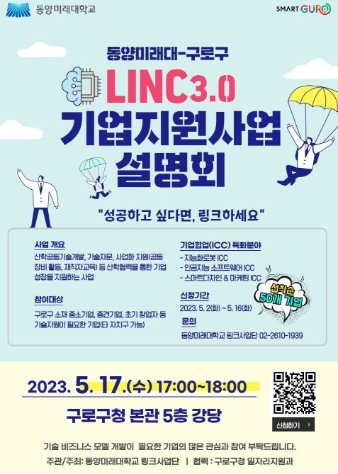 [제주교통복지신문 김강석 기자] 구로구가 오는 17일 오후 5시 구청 강당에서 ‘동양미래대학교 LINC3.0 기업지원 사업설명회’를 개최한다.