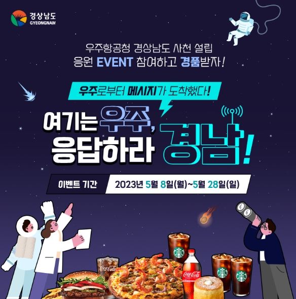 이벤트 참여방법은 이벤트 페이지에 우주항공청 설치를 위한 응원 게이지를 채우거나, 경상남도 공식 유튜브 ‘경남TV’에 게시된 이벤트 영상에 응원의 댓글을 남기면 참여할 수 있으며, 추첨을 통해 커피상품권 등 다양한 상품을 증정할 예정이다.