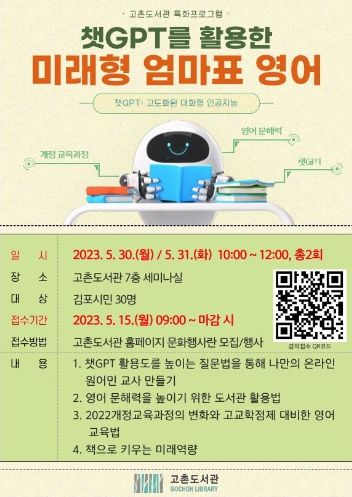 [제주교통복지신문 김강석 기자] 김포시 고촌도서관(관장 이연화)은 오는 30일과 31일 이틀에 걸쳐 오전 10시부터 약 2시간 동안 도서관 7층 세미나실에서 고촌도서관 특화프로그램 ‘챗GPT를 활용한 미래형 엄마표 영어’ 프로그램을 운영한다.