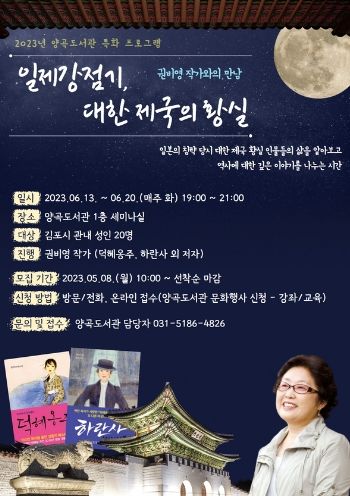 [제주교통복지신문 김강석 기자] 김포시립 양곡도서관은 호국보훈의 달인 6월을 맞아 6월 13일부터 20일까지 매주 목요일 오후 7시 도서관 1층 세미나실에서 도서관 특화 프로그램 ‘일제강점기, 대한 제국의 황실’을 운영한다.