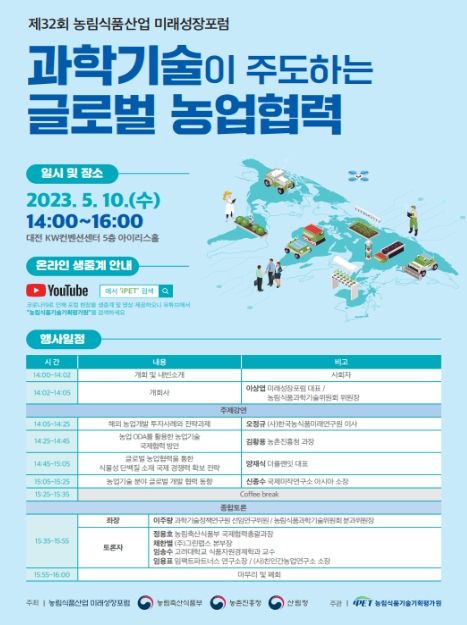 [제주교통복지신문 김강석 기자] 농림축산식품부가 주최하고, 농림식품기술기획평가원이 주관하는 ‘제32회 농림식품산업 미래성장포럼(이하 미래성장포럼)’이 “과학기술이 주도하는 글로벌 농업협력”을 주제로 5월 10일 수요일 14시 대전 KW컨벤션센터 아이리스홀에서 개최된다.