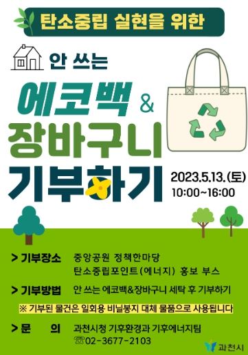 과천시 관계자는 “과천시는 앞으로도 탄소중립 실현을 위해 다양한 정책을 모색하고 추진해나가겠다. 이번에 진행되는 에코백과 장바구니 기부 행사에도 시민 여러분의 많은 관심과 참여를 부탁드린다”라고 말했다.