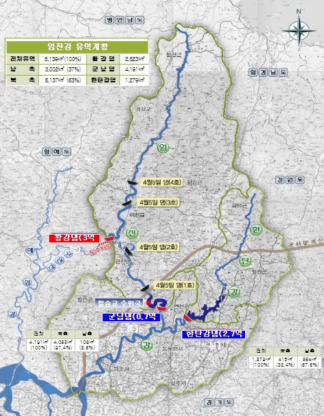 임진강은 유역의 절반 이상이 북한에 위치한 남북공유하천으로 북측 댐 방류로 인한 피해를 줄이기 위해 정부는 고해상도 위성영상 등을 활용하여 북측 댐 상황을 면밀하게 감시하고 있다.