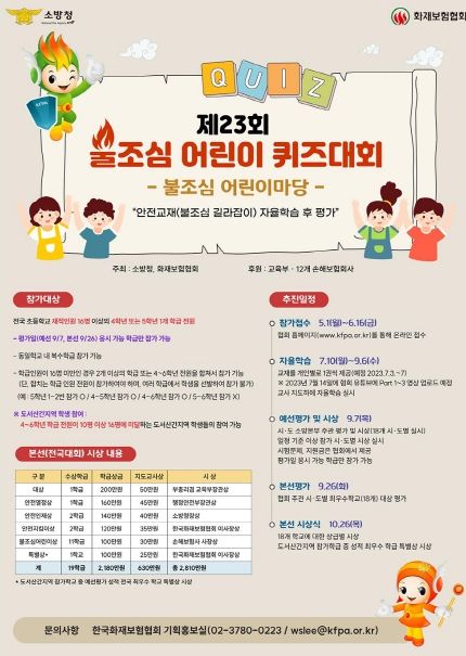 소방청은 소방청과 한국화재보험협회가 공동으로 주최하는 『제23회 불조심 어린이 퀴즈대회』 참가 학급을 6월 16일까지 모집한다고 밝혔다.