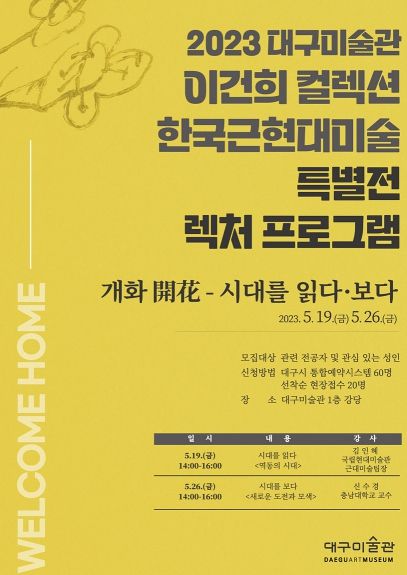 [제주교통복지신문 김강석 기자] 대구미술관은 ‘이건희 컬렉션 한국근현대미술 특별전’을 연계한 미술 전문 강좌 ‘개화-시대를 읽다·보다’를 5월 19일, 26일 오후 2시 대구미술관 강당에서 운영한다.