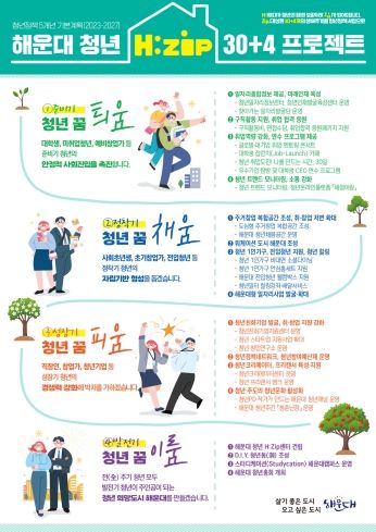 [제주교통복지신문 김강석 기자] 해운대구는 청년이 살기 좋고, 오고 싶은 도시 해운대를 만들기 위해 청년정책 5개년 기본계획인 ‘해운대 청년 H:Zip.30+4 프로젝트’를 추진한다.