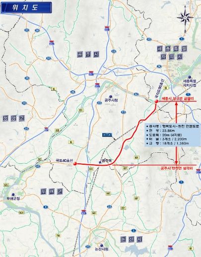 사업 노선은 세종시 장군면(금암리)에서 공주시 마암(청벽)을 거쳐 KTX공주역, 탄천면(삼각리)을 잇는 23.5km 왕복 4차로를 연결하는 것으로 총사업비는 4365억원이 투입될 예정이다.