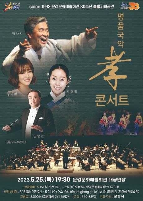 [제주교통복지신문 김강석 기자] 영남국악관현악단과 국내 최정상 소리꾼 장사익, 박애리, 그리고 미스트롯1 선 출신의 가수 정미애가 함께하는 명품 국악 孝 콘서트가 오는 5월 25일 (목) 19:30에 문경문화예술회관 대공연장에서 개최된다.