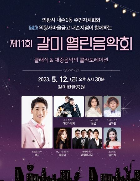 [제주교통복지신문 김강석 기자] 의왕시 내손1동 주민자치회가 오는 12일 오후 6시 30분 갈미한글공원에서 ‘제11회 갈미열린음악회’를 개최한다고 밝혔다.
