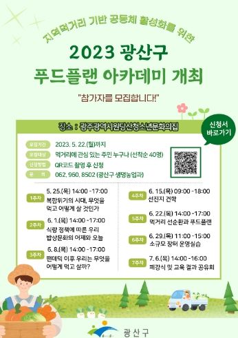 [제주교통복지신문 김강석 기자] 광주 광산구는 22일까지 ‘푸드플랜 아카데미’ 참가자를 모집한다고 밝혔다.