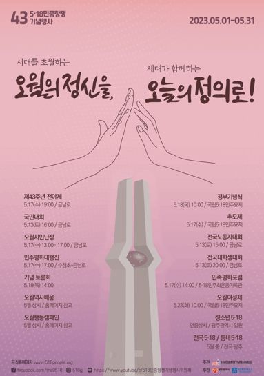 [제주교통복지신문 김강석 기자] 제43주년 5‧18민주화운동 기념행사가 시민, 대학생, 세계민주주의·인권운동가들이 대거 참여한 가운데 다채롭게 펼쳐진다.