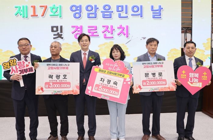 영암읍 잔치에서는 차경숙 농업회사법인㈜명성제분 대표이사가 500만 원을, 곽광호 칸라이팅 대표이사가 300만 원을, 문병로 ㈜하나이엔지 대표가 200만 원을 각각 기탁했다.