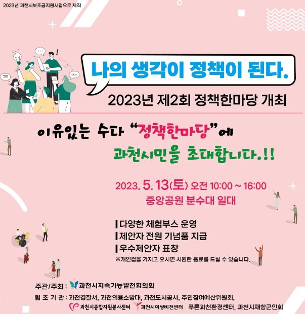 [제주교통복지신문 김강석 기자] 과천시는 오는 13일 중앙공원 분수대 일원에서 ‘제2회 정책한마당’ 행사를 열고, 시민의 다양한 정책 아이디어를 듣는다.