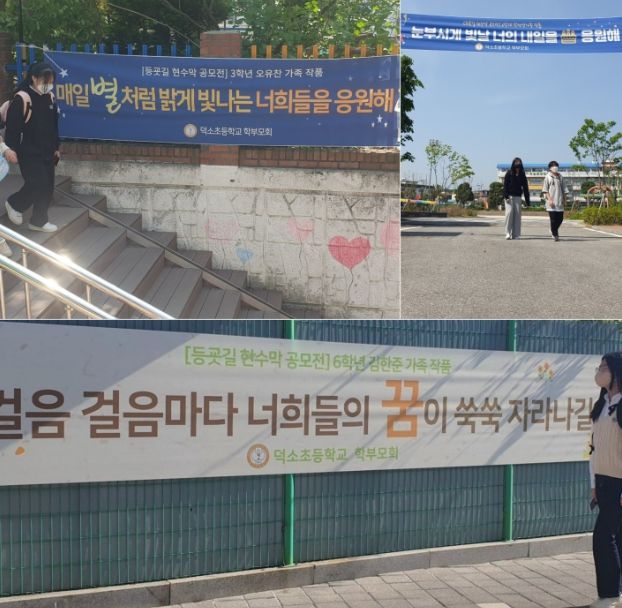 ‘등굣길 응원 현수막 공모전’은 부모님들이 응원하는 덕소초등학교 학생들의 행복한 등굣길을 위해 기획됐다. 학생들을 사랑하고 응원하는 마음을 담은 주제로 각 가정에서 40여 편의 문안을 공모했으며, 학부모 전체가 함께 투표하여 당선작을 선정했다. 당선작은 학교 정문과 후문에 현수막으로 게시되어 매일 아침 등교하는 학생들을 반갑게 맞으며 응원하고 있다.