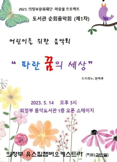 공연 첫날인 5월 14일 오후 3시에는 2023년 의정부 문화예술 마중물 프로젝트에 선정된 의정부유스필챔버오케스트라의 연주회 ‘파란 꿈의 세상’을 선보인다. 푸르른 5월, 꿈이 가득한 어린이들을 위해 동요, 영화음악을 연주할 예정이다.