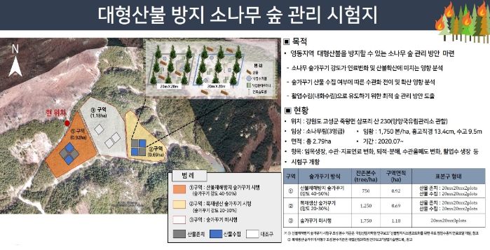 국립산림과학원은 2020년부터 강원도 고성에서 자라고 있는 소나무 숲에 ▲산불 피해 저감 관리 숲 ▲목재생산 관리 숲 ▲관리하지 않은 숲 등 목적별 숲을 조성(약 2.8ha)하여 숲의 환경 변화와 산불 확산 특성을 지속적으로 연구하고 있다(참고 1).