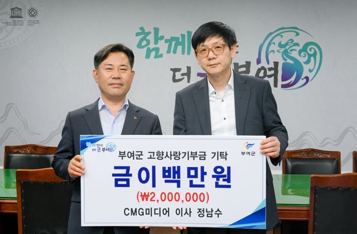 이날 ㈜CMG미디어의 정남수 이사는 이날 부여군에 고향사랑기부금 200만원을 전달했다. ㈜CMG미디어는 방송프로그램 기획‧제작, 광고 제작‧송출, 온라인 생중계, 이벤트 홍보 대행 등을 전문으로 하는 글로벌 종합 콘텐츠기업으로서 굿뜨래 광고영상과 부여 세도 방울토마토‧유채꽃 축제 홍보영상 등을 제작한바 있다.