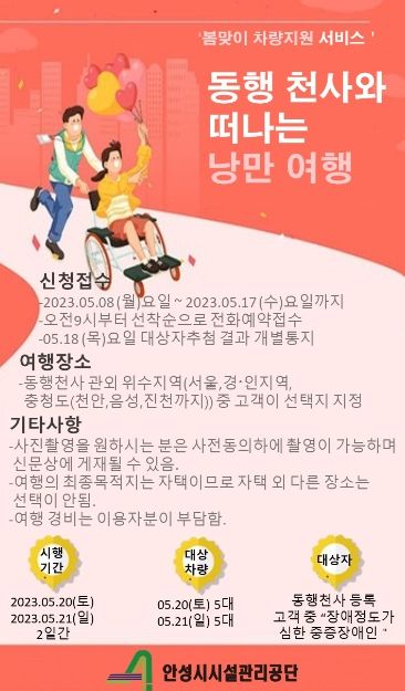 [제주교통복지신문 김강석 기자] 안성시시설관리공단에서 운영하는 교통약자이동지원센터 “동행천사”는 5월 20일(토), 21일(일) 양일간 봄맞이 차량지원 서비스인 “동행천사와 떠나는 낭만여행”을 실시한다고 밝혔다.