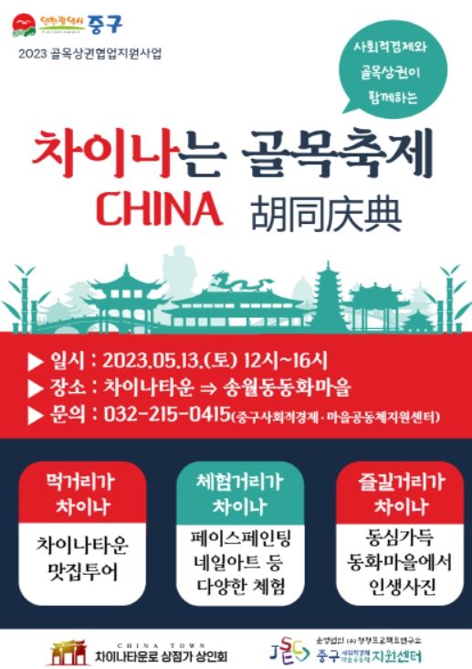 [제주교통복지신문 김강석 기자] 인천 중구 사회적경제·마을공동체 지원센터는 5월 가정의 달을 맞이하여 관내 골목상권에 활기를 불어넣기 위해 13일 오후 12시부터 차이나타운과 동화마을 일대에서 ‘사회적경제와 골목상권이 함께하는 '차이나는 골목축제'’를 개최한다고 밝혔다.
