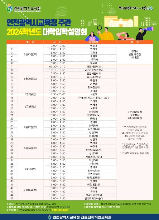 설명회는 13일 인하대학교 본관 대강당(하나홀)에서 시작하며, 20일부터 7월 15일까지는 인천시교육청 정보센터 대회의실에서 진행한다.