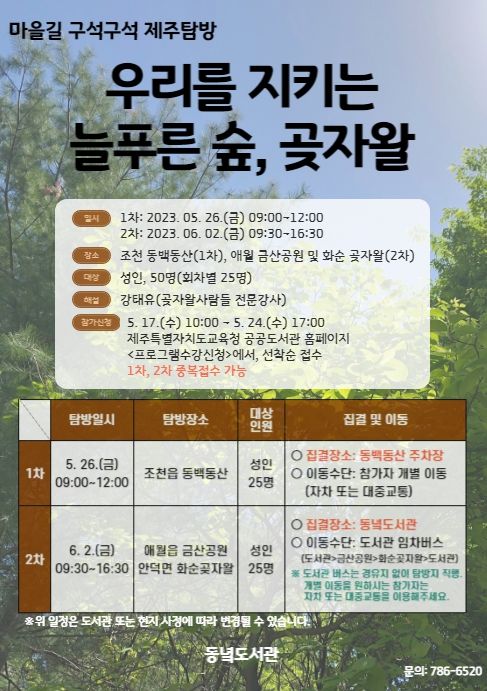 [제주교통복지신문 박희찬 기자] 제주도교육청 제주도서관 동녘도서관은 제주 곶자왈의 생태적 가치를 알리고 보전의 필요성을 알리기 위해‘2023년 상반기 마을길 구석구석 제주탐방 – 우리를 지키는 늘푸른 숲, 곶자왈’을 운영한다.
