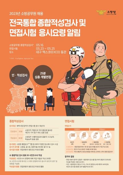 소방공무원 전국 통합 종합적성검사 및 면접시험은 오는 23일부터 25일까지 3일간 대구 엑스코(Exco)에서 치러진다.