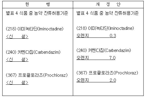 식약처와 농진청은 30여 일간의 후숙이 필요한 오렌지의 특성을 고려하여 저장병 방제에 효과가 있는 카벤다짐 등 3종 농약을 대상으로 작물 잔류시험 등 과학적 검증을 거쳐 안전성을 신속히 확인하고, 해당 농약 3종의 잔류허용기준과 안전사용기준을 마련했다.