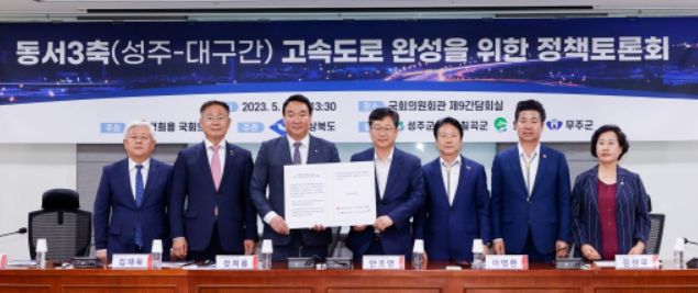 토론회에 앞서 “동서3축 성주~대구간 고속도로 조기건설”을 위해 영호남 지역국회의원(정희용·안호영 의원)과 성주·칠곡·무주·달성군 지방자치 단체장이 공동건의문에 서명하여 지역주민의 공동 의지를 중앙정부에 전달했다.