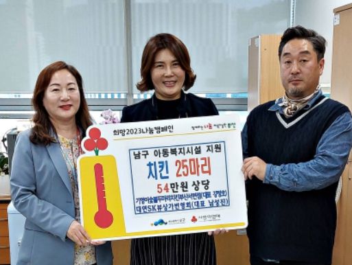 [제주교통복지신문 김강석 기자] 기영이숯불두마리치킨 부산서면점과 대연SK뷰상가번영회에서는 가정의 달을 맞아 지난 8일 부산광역시 남구 관내 공동생활가정 6개소에 시설 아동들의 건강과 행복을 기원하며 치킨 25마리(54만원 상당) 및 현금 30만원을 전달했다.