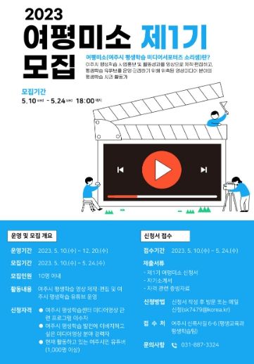 [제주교통복지신문 김강석 기자] 여주시 평생교육과에서는 여주시 평생학습 사업홍보 및 활동성과를 영상으로 제작·편집하고, 평생학습 유튜브를 운영·관리하기 위해 '제1기 여평미소'를 모집한다.