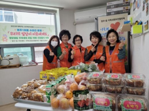 ‘우리의 일상이 이웃에게도, 영주1마을 수라간’사업은 매월 1회 관내 홀로 어르신, 결식우려 세대 등 취약계층 20세대에 건강한 먹거리를 지원하는 사업으로, 이번에는 9종류(돼지양념불고기, 사골곰탕, 김치, 상추, 오이고추, 사과, 오렌지, 우유, 빵)의 음식을 각 세대에 전달하고, 가구별 모니터링을 실시했다.