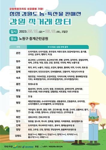[제주교통복지신문 김강석 기자] 강원도가 5월 12일 부터 서울 노원구 중계근린공원에서‘23년 '강원 직거래장터'’를 운영한다.
