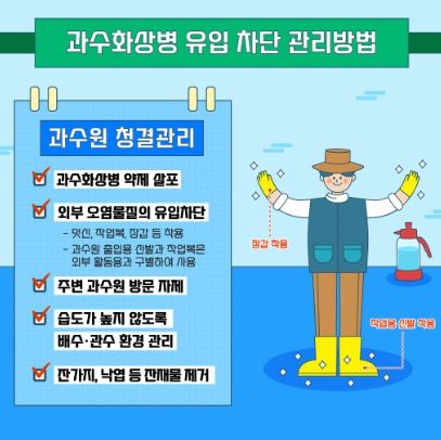 따라서 화상병 유입 차단을 위해 화상병 전용 약제를 적기 살포하고 농작업 시 작업 도구와 착용한 장갑을 수시로 소독해야한다.