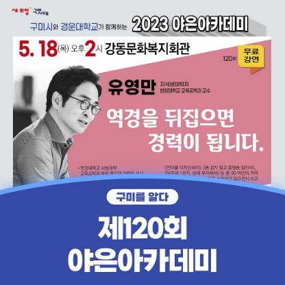 [제주교통복지신문 김강석 기자] 구미시평생학습원(원장 이종우)은 18일 오후2시 강동문화복지회관에서 한양대 교수 유영만의‘역경을 뒤집으면 경력이 됩니다’라는 주제로 '제120회 야은아카데미'무료 강연을 한다.