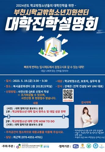 [제주교통복지신문 김강석 기자] 부천여성청소년재단은 오는 5월 19일, 부천시학교밖 청소년지원센터에서 학교 밖 청소년의 입시를 돕기 위한 『2024년 대학진학 설명회』를 개최할 예정이라고 전했다.