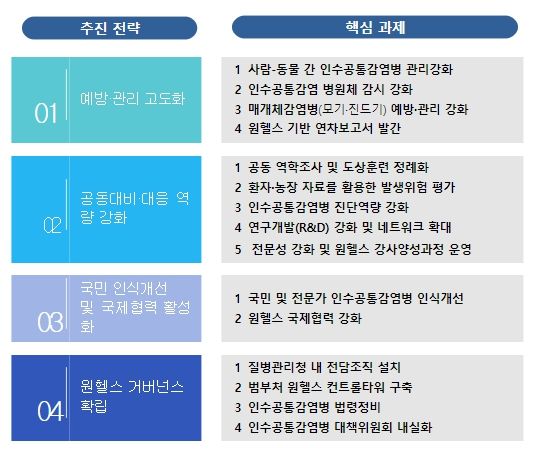 마지막으로, 이상의 과제들을 보다 효과적이고 전략적으로 추진하기 위해 ▲원헬스 전담조직 설치를 포함한 추진체계 정비, ▲'인수공통감염병 대책위원회' 위상 강화 및 운영 내실화, ▲관계부처 간 정보공유 확대를 위한 시스템 정비 등 인프라도 강화해 나갈 계획이다.