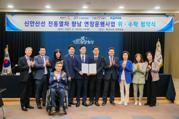 이날 협약식에는 화성시의회 김경희 의장, 조오순, 공영애, 이계철 의원을 비롯한 송옥주 국회의원, 정명근 화성시장, 국가철도공단, 한국철도공사, 넥스트레인 관계자 등이 참석해 신안산선 전동열차 향남 연장운행사업 위·수탁 협약식을 가졌다.