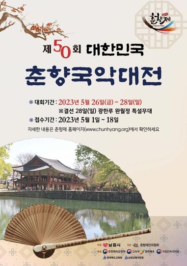이번, 대한민국 춘향국악대전은 2023년 5월 26일부터 5월 28일까지 진행되며, 본선 5월28일은 그동안 코로나19로 축소됐던 대회에 활력을 불어넣고자 광한루 완월정 야외공연장에서 진행된다.