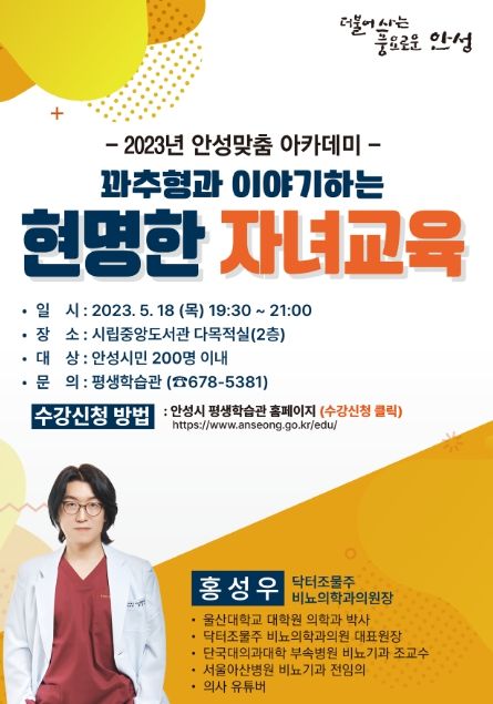 [제주교통복지신문 김강석 기자] 안성시는 오는 5월 18일(목) 저녁 7시 30분 시립중앙도서관 다목적실(2층)에서 안성맞춤아카데미 3회차 강연으로 꽈추형으로 잘 알려진 홍성우 조물주비뇨의학과원장을 초청하여 ‘꽈추형과 이야기하는 현명한 자녀 성교육’이라는 주제로 강연을 펼칠 예정이다.
