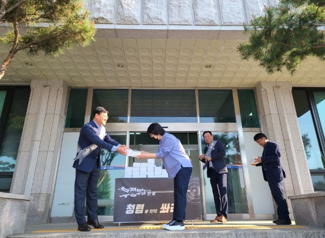 [제주교통복지신문 김강석 기자] 정창훈 도시정책과장은 건축과장 엄기헌 과장과 함께 11일(목) 아침을 거르고 출근하는 2 개과 직원들을 위한 협업으로 ‘부정부패를 막는 한발 청렴을 향해 쏴라.’ 이벤트를 준비했다.