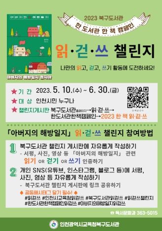 이번 챌린지는 2023년 한 도서관 한 책 캠페인 선정도서 ‘아버지의 해방일지’를 바탕으로 인천시민이 자유롭게 서평, 사진, 영상 등 다양한 방법으로 읽·걷·쓰 활동을 인증 또는 공유하면 된다.