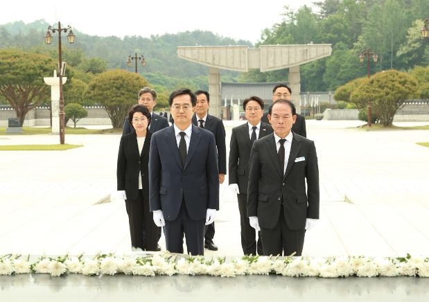 김 지사는 강기정 광주광역시장과 함께 추모탑에 헌화, 분향한 뒤 경기도민 묘소와 이한열 열사 묘소를 찾았다.