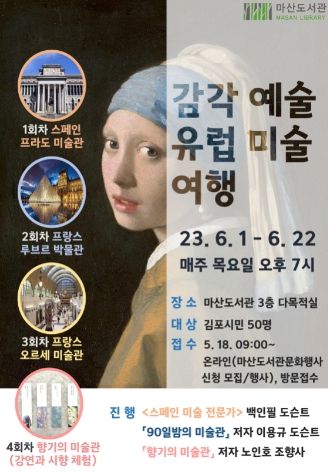 [제주교통복지신문 김강석 기자] 여행 특화 도서관인 김포시립 마산도서관(관장 이연화)의 기획 프로그램 ‘마산도서관 여행학교’의 6월(유럽) 프로그램 ‘감각예술–유럽미술 여행’이 오는 6월 1일부터 22일까지 매주 목요일 오후 7시부터 두 시간 동안 마산도서관 3층 다목적실에서 4회에 걸쳐 진행된다.